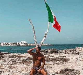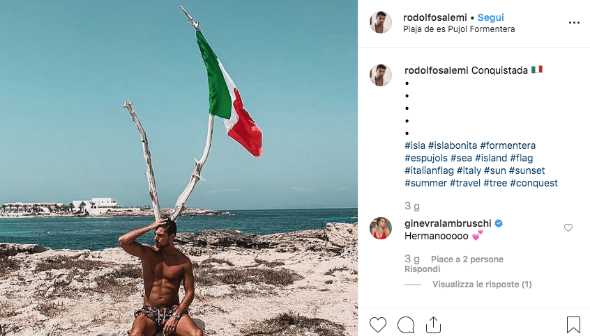 Seduto su una roccia dell’isola di Formentera, Salemi è seduto davanti a un ramo biforcuto a forma di corna, che spuntano proprio dietro la sua testa. Non solo, su uno dei due rami sventola una bandiera dell’Italia. E, per concludere in bellezza, l’ex tronista e tentatore scrive: “Conquistada” (in spagnolo).