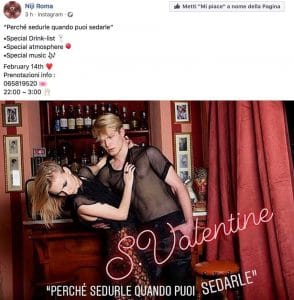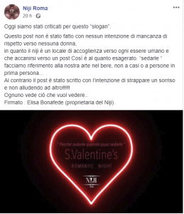 “Perché sedurle quando puoi sedarle” è la frase racchiusa nel post, pubblicato su Facebook e poi rimosso, del cocktail bar Niji Roma. Un modo, forse, per risultare più convincenti e attirare più clienti possibile il 14 febbraio, nella festa dedicata agli innamorati.