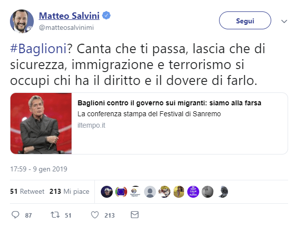 Ma il vicepremier Matteo Salvini risponde subito via Twitter: “#Baglioni? Canta che ti passa, lascia che di sicurezza, immigrazione e terrorismo si occupi chi ha il diritto e il dovere di farlo”.