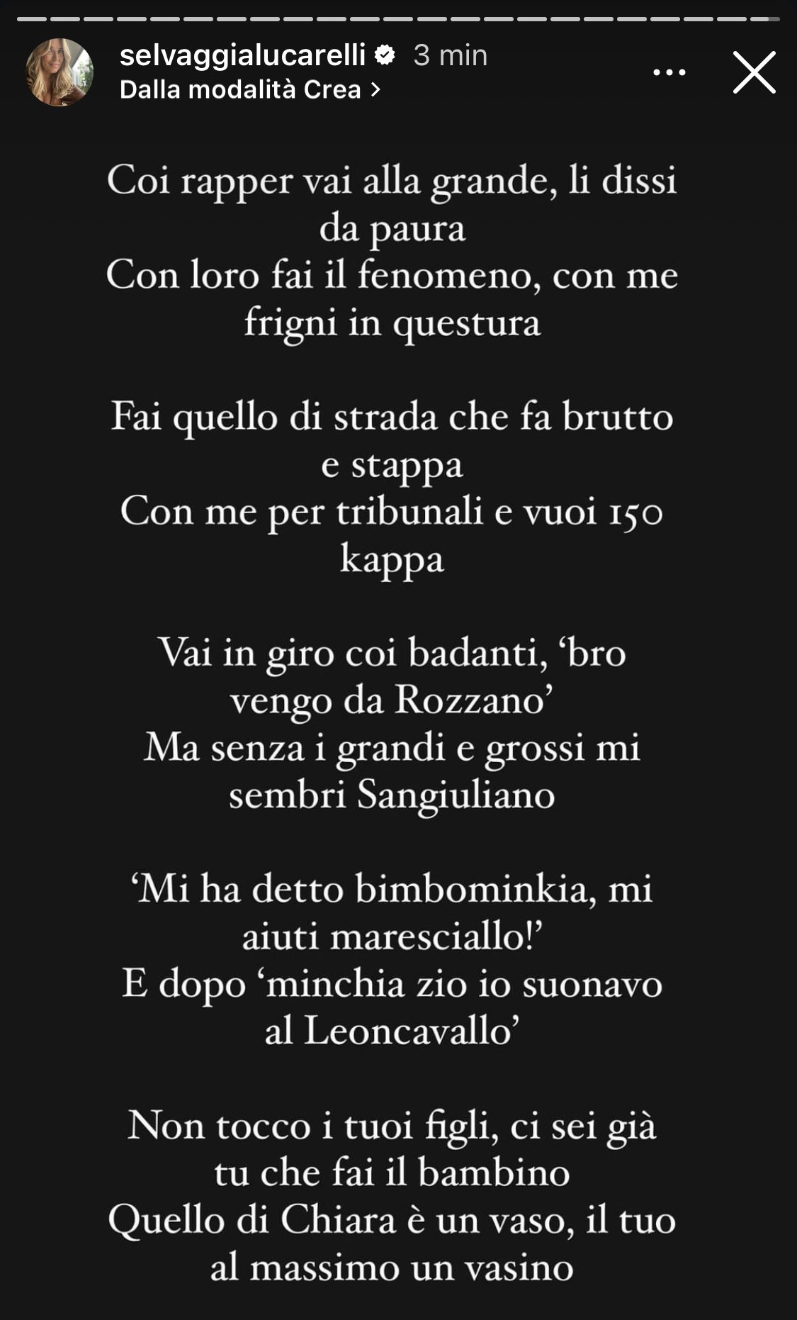 Ora è arrivata la risposta di Selvaggia Lucarelli che, con grande ironia, ha proposto tra le stories del suo profilo Instagram anche lei una replica in rima.
