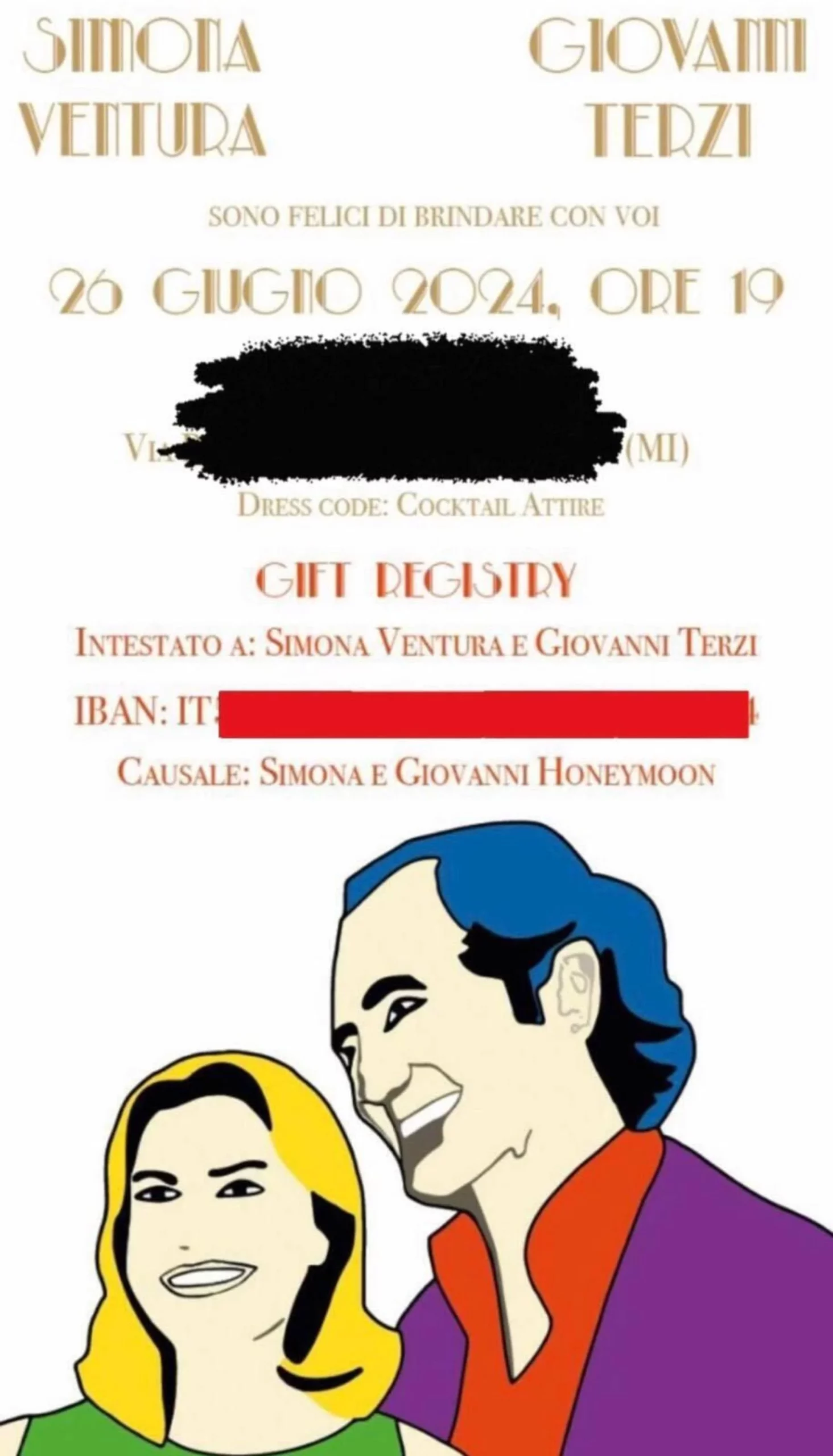 La coppia, infatti, sulle partecipazioni ha pubblicato anche l’Iban con causale “Simona e Giovanni Honeymoon”. Agli invitati, dunque, sarebbe stato chiesto un piccolo contribuito per il viaggio di nozze. Una scelta molto comune che ha destato perplessità solo ed esclusivamente per il fatto che la coppia non ha problemi economici, anzi.