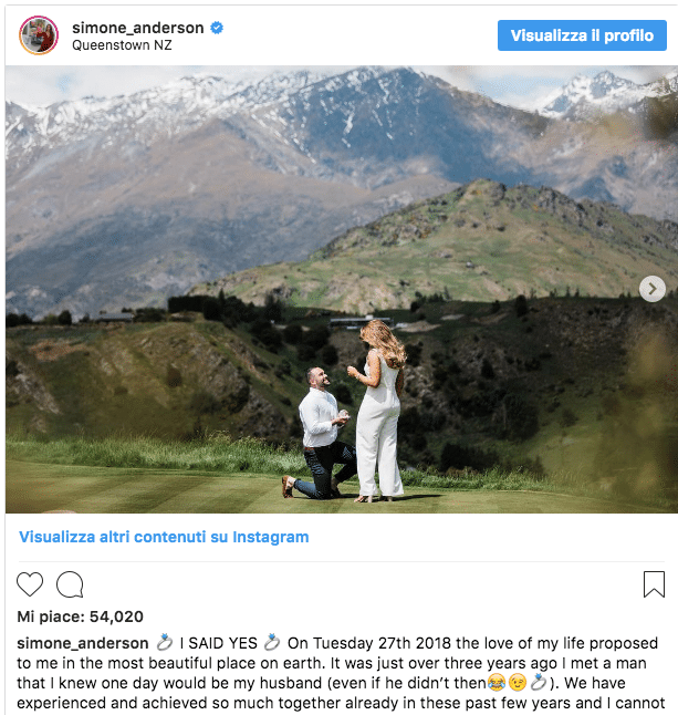 La proposta di matrimonio è stata raccontata in ogni suo dettaglio sul profilo Instagram di Simone Anderson.