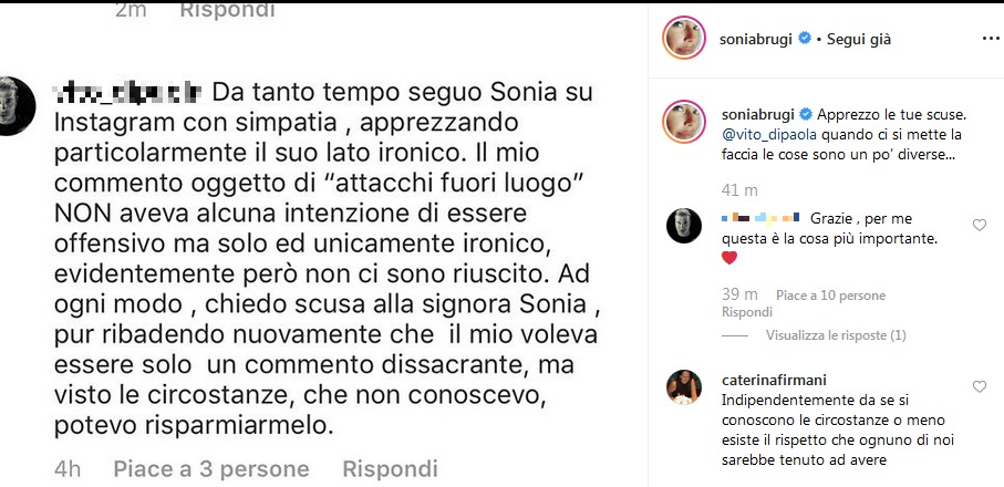Il botta e risposta è continuato con la risposta del commentatore che ha scritto così: “Buongiorno Sonia per quello che può valere ti pongo le mie più sentite scuse. Ma ti prego di credermi che il mio intento non era assolutamente offensivo o denigratorio. Ad ogni modo, sono inquieto e rattristato per lo spiacevole episodio”.