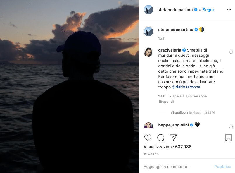 Per documentare la breve vacanza in mare, Stefano De Martino ha condiviso su Instagram un romantico video al tramonto e proprio sotto quel post è apparso un commento che ha attirato l’attenzione dei fan più appassionati. “Smettila di mandarmi questi messaggi subliminali… il mare… il silenzio, il dondolio delle onde… ti ho già detto che sono impegnata Stefano!”, recita il messaggio. A scriverlo, però, non è una spasimante del ballerino bensì l’attrice comica Valeria Graci che faceva coppia con Katia Follesa nei programmi Colorado Cafè e Zelig.