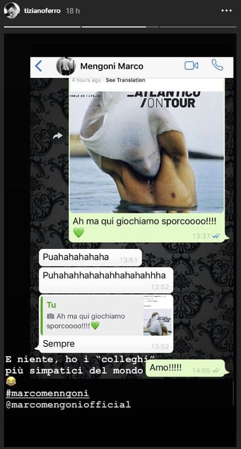 Tiziano Ferro, forse per stuzzicare giocosamente il collega, manda la foto su WhatsApp all’amico, accompagnandola con il messaggio al limite del malizioso “Ah ma qui giochiamo sporcooo!!!”, con tanto di cuoricino verde alla fine.