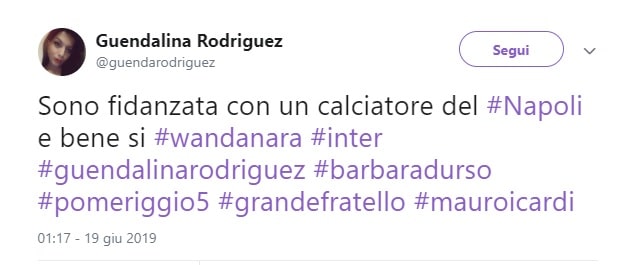Il tweet è stato pubblicato da Guendalina Rodriguez martedì 18 giugno e accompagnato da hashtag che rimandano a Icardi e sua moglie Wanda Nara, ma anche a Barbara D’Urso e alle trasmissioni Mediaset Grande Fratello e Pomeriggio 5. Nei commenti al messaggio sono spuntate anche offese e battute volgari.