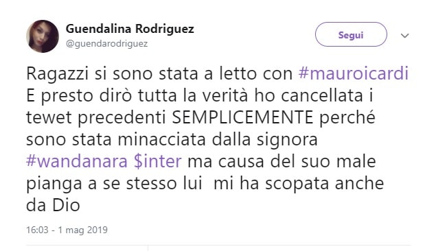 Di una presunti rapporti con Icardi invece la Rodriguez ha parlato in un tweet del 1° maggio. “Ragazzi sono stata a letto con #mauroicardi. E presto dirò tutta la verità ho cancellato i tweet precedenti semplicemente perché sono stata minacciata dalla signora Wanda Nara ma chi è causa del suo male pianga a se stesso. Lui mi ha sc… anche da Dio”.