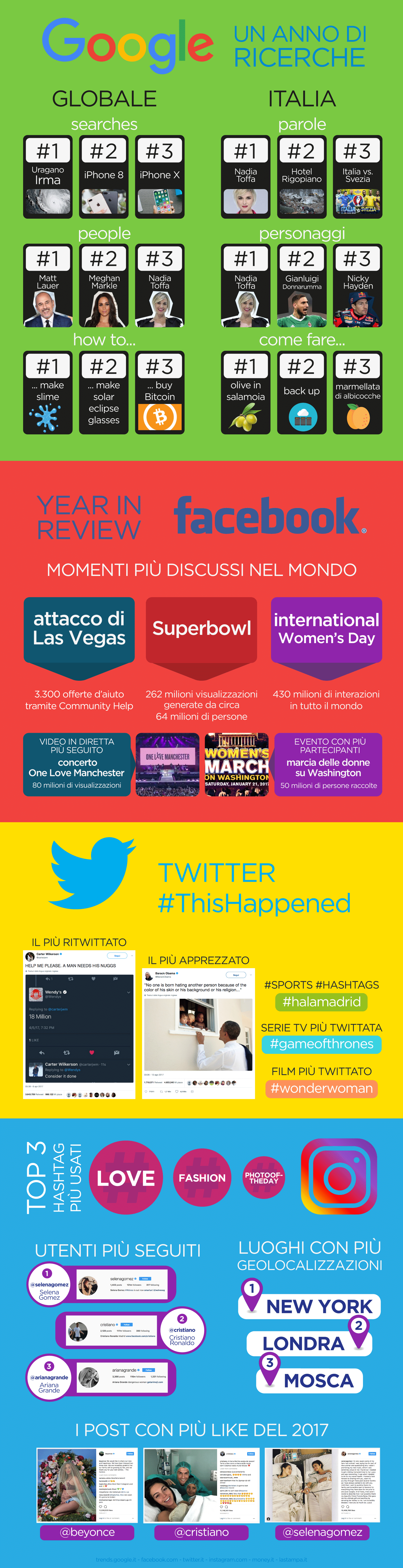 Un’infografica realizzata da Stampaprint mostra quali sono stati i trend su Google, su Facebook, su Twitter e su Instagram nel 2017, in Italia e a livello globale.