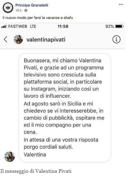 “Ad agosto sarò in Sicilia e mi chiedevo se vi interesserebbe, in cambio di pubblicità, ospitare me ed il mio compagno per una cena. In attesa di una vostra risposta porgo cordiali saluti. Valentina”, aveva scritto Valentina Pivati al ristorante presentandosi come influencer.