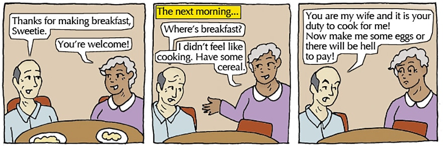 “Grazie per la colazione, cara” -“Prego!” -“Dov’è la colazione?”-“Non mi andava di cucinare. Puoi mangiare i cereali” -“Tu sei mia moglie ed è tuo dovere cucinare per me! Ora fammi delle uova o peggio per te!”
