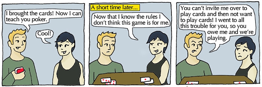 “Ho portato le carte! Ora posso insegnarti a giocare a poker” -“Figo!” -“Ora che so le regole penso che non faccia per me” -“Non puoi invitarmi per giocare a carte e poi tirarti indietro! Ho fatto tutto questo per te e ora me lo devi: giochiamo a carte”
