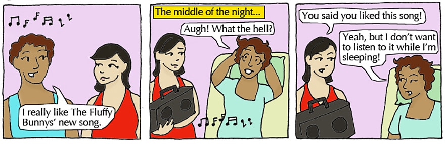 “Mi piace veramente la nuova canzone di Fluffy Bunny”- “Ma che diavolo è?!”-“Avevi detto che ti piaceva!”-“Si’, ma non mi piace ascoltarla mentre dormo!”