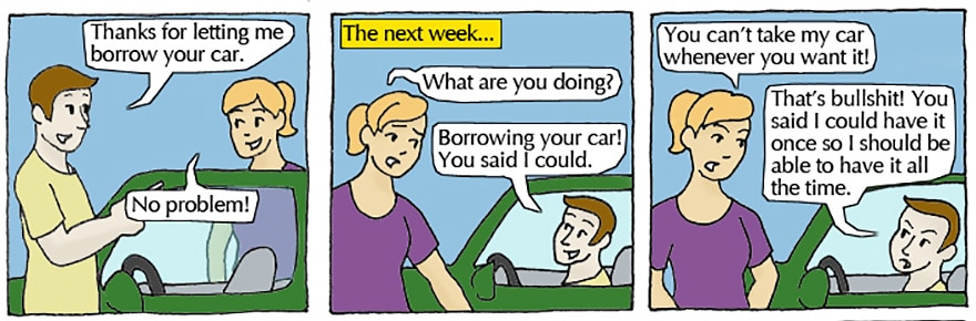 “Grazie per avermi prestato la tua macchina”-“Che stai facendo?” -“Prendo in prestito la tua macchina! Una volta mi avevi detto che potevo farlo” -“Non puoi prendere la mia macchina quando ti pare!”-“Stronzate! Una volta mi hai detto che potevo prenderla, quindi posso farlo quando voglio”