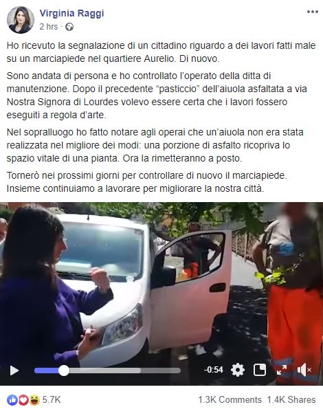 Il momento in cui Virginia Raggi bacchetta gli operai per il loro modo di lavorare è stato ripreso in un video successivamente pubblicato sulla pagina Facebook del sindaco. In didascalia al post si legge il commento di Virginia Raggi: