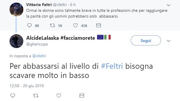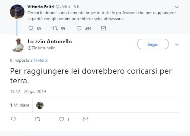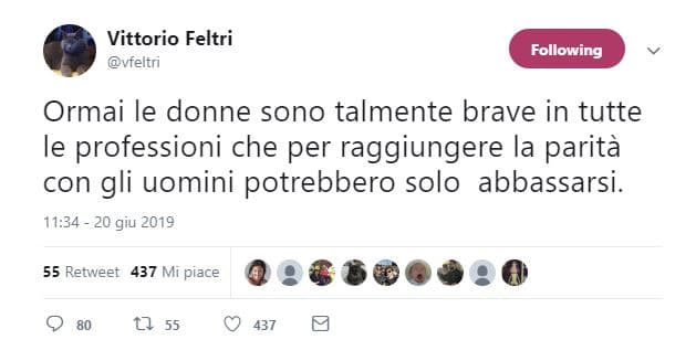 Il 20 giugno, sul social network è apparso un tweet in cui il giornalista bergamasco cerca di spiegare il suo punto di vista sulla parità di genere. “Ormai le donne sono talmente brave in tutte le professioni che per raggiungere la parità con gli uomini potrebbero solo abbassarsi”, scrive Feltri.
