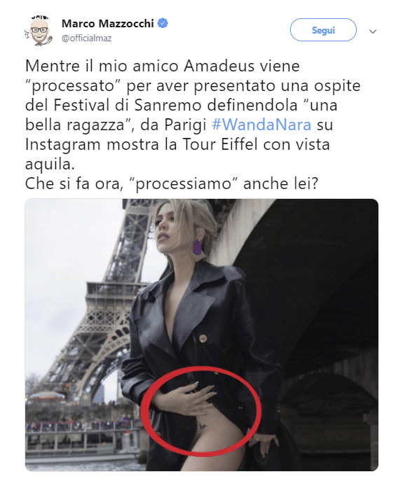Ad esempio, a fare il suo nome è stato Marco Mazzocchi, giornalista sportivo della Rai che ha voluto difendere Amadeus dopo le tante polemiche scatenate da una frase detta in conferenza stampa. “Mentre il mio amico Amadeus viene “processato” per aver presentato una ospite del Festival di Sanremo definendola “una bella ragazza”, da Parigi Wanda Nara su Instagram mostra la Tour Eiffel con vista aquila. Che si fa ora, “processiamo” anche lei?”.