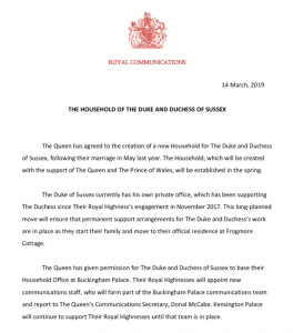 Harry e Meghan, comunque, anche se avranno i loro uffici centrali a Buckingham Palace, avrebbero intenzione di trasferirsi a Frogmore Cottage, un edificio della famiglia reale in fase di ristrutturazione. Anche la comunicazione – e i relativi bureaux – dei due fratelli è stata scissa, come si può leggere nel comunicato stampa del 14 marzo 2019.