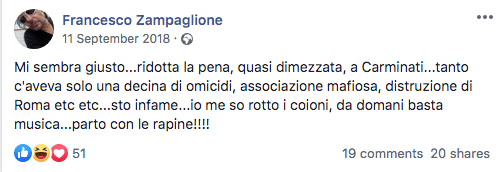 L’autore del furto e fratello dell’artista criticava la riduzione della pena al criminale esponente del gruppo d’ispirazione neofascista Nuclei Armati Rivoluzionari, Massimo Carminati, che risale appunto all’anno scorso. E nel post scriveva: “Tanto c’aveva solo una decina di omicidi, associazione mafiosa, etc.. io me so rotto i coglioni, da domani basta musica…parto con le rapine!!!”