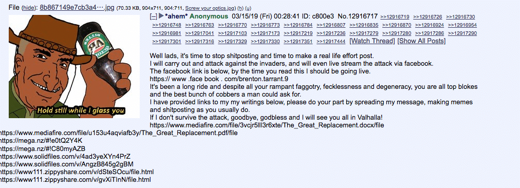 Il messaggio di Tarrant è stato pubblicato alle 12:28 del 15 marzo 2019 della Nuova Zelanda.