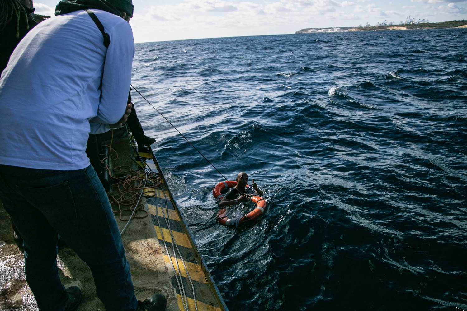 “Uomo in mare, uomo in mare”. A urlarlo siamo io e altri due colleghi a bordo. All’improvviso vediamo uno dei migranti che si tuffa in acqua e inizia a nuotare.