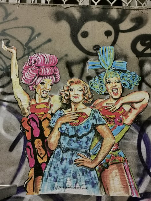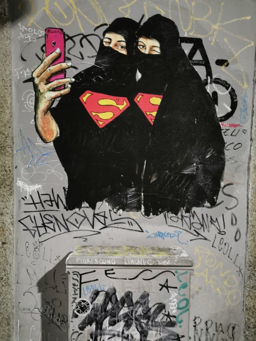 Altra opera ricorrente, già sui muri di Firenze, quella delle ragazze con il niqab che posano per un selfie: “Perché la gioia della femminilità può esprimersi sotto qualsiasi vestito”. Insieme alle super donne il danzatore e attore Manuel Frattini, scomparso nel 2019, ricordato qui nei panni della sua amata Priscilla.