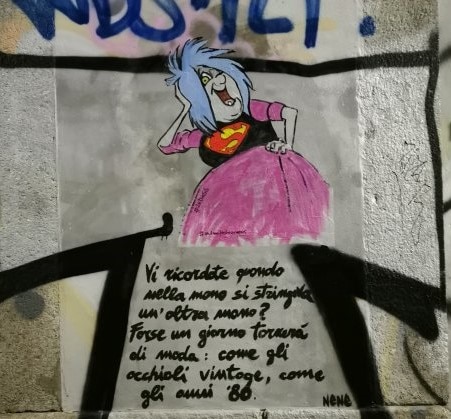 Sui muri del quartiere sono comparse anche Barbie-mascherina, dissacrante satira nei confronti della psicosi dilagata con il Coronavirus, che porta al braccio un sacchetto con la scritta “vado a Whuan”, e la mitica Maga Magò, protagonista Disney e della nostra infanzia.