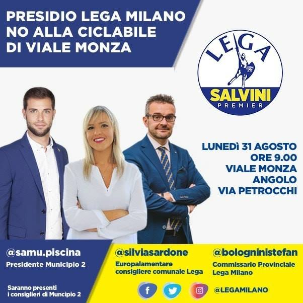 L’orario dell’appuntamento è un po’ insolito, per una manifestazione politica: lunedì mattina alle 9, quando Milano riprende a lavorare. E lo schieramento di forze è imponente: la Lega annuncia la presenza di tre suoi esponenti, che corrispondono a sei cariche. Stefano Bolognini è assessore della Regione Lombardia e commissario del partito nella provincia di Milano, Silvia Sardone è europarlamentare e consigliera comunale a Palazzo Marino, mentre Samuele Piscina è presidente del Municipio 2, nonché responsabile della Lega degli enti locali. Quest’ultimo sarà accompagnato dai consiglieri della circoscrizione, competente per territorio.