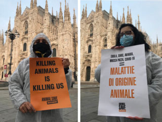 Gli attivisti di Milano Animal Save e Milano Climate Save hanno tenuto un sit-in scenografico in Piazza Duomo con cartelli e tute anticontaminazione per evidenziare le correlazioni che ci sono tra il diffondersi delle pandemie, l’industria zootecnica, gli allevamenti di pellicce, la crisi ecologica e climatica. “Killing animals is killing us”, ovvero uccidere gli animali ci sta uccidendo, è stato uno degli slogan della manifestazione: benché l’origine della pandemia del Covid-19 sia tuttora incerta, gli studiosi sono concordi nell’individuare il contatto con specie animali selvatiche come grave fattore di rischio per la diffusione di zoonosi, ovvero malattie trasmesse dagli altri animali.