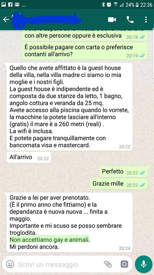 Gennaro Casalino è un ragazzo omosessuale di Napoli che dopo aver prenotato un alloggio per il mese di agosto in una località turistica nei pressi di Tropea, in provincia di Vibo Valentia, in Calabria, ha ricevuto dai proprietari dell’appartamento un chiaro messaggio nel quale si spiegava che gay e animali non erano graditi.