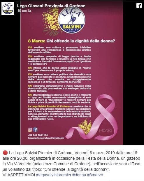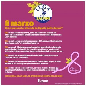 Proprio per questo, Futura, l’associazione vicina a Laura Boldrini, reagisce con ironia all’accaduto e sui social rilancia con un volantino alternativo. Scrivendo: “Avevano sbagliato in tipografia, questo è il vero volantino sulle donne fatto dalla Lega di Crotone”.