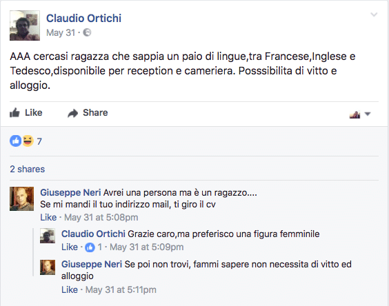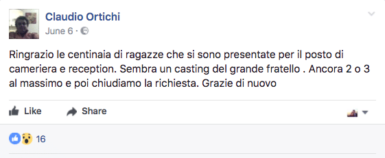 L’albergatore Ortichi non ha mai pubblicato il fantomatico annuncio di lavoro, limitandosi a pubblicare sul suo profilo Facebook da 1.263 amici la richiesta, aggiungendo che la ragazza avrebbe dovuto conoscere un paio di lingue e ricoprire il ruolo di cameriera o receptionist ma senza specificare altro.