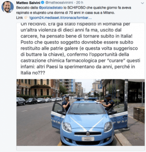 “Posto che questo soggetto dovrebbe essere subito restituito alle patrie galere (e questa volta suggerisco di buttare la chiave), confermo l’opportunità della castrazione chimica farmacologica per `curare´ questi infami: altri paesi la sperimentano da anni, perché in Italia no?”, ha concluso.