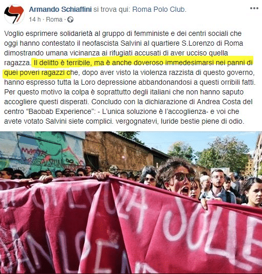 “Gli assassini di #Desirée erano “depressi” a causa del “razzismo” del governo italiano, “delitto terribile” ma serve “immedesimarsi nei panni di quei poveri ragazzi”. Così dice tal Armando Schiaffini. Oltre al TSO speriamo in un magistrato attento”, scrive Morisi.