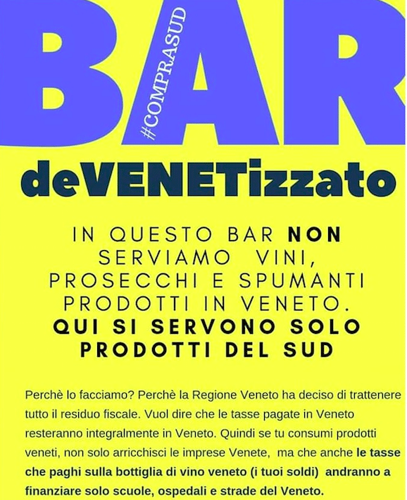 “La Regione Veneto ha deciso di trattenere tutto il residuo fiscale – si legge nel colorato manifestino – Vuol dire che le tasse pagate in Veneto resteranno integralmente in Veneto. Quindi se tu consumi prodotti veneti, non solo arricchisci le imprese venete, ma significa anche che le tasse che paghi sulla bottiglia di vino veneto (i tuoi soldi) andranno a finanziare solo scuole, ospedali e strade del Veneto. E le scuole, ospedali e strade del Sud chi li finanzia?”.