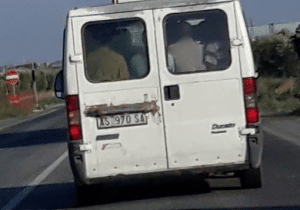 La foto mostra il retro di un furgoncino bianco: dai lunotti posteriori si vede che a bordo ci sono diverse persone, molto probabilmente più del consentito.