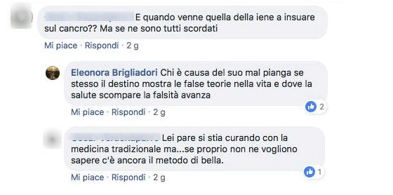 Brigliadori, che già in passato si era fatta notare per le sue posizioni anti-scientifiche e scettiche nei confronti della medicina tradizionale, è stata imbeccata sulla sua bacheca Facebook da un utente che ha scritto: “E quando venne quella delle iene a insinuare sul cancro? Se ne sono tutti scordati”.