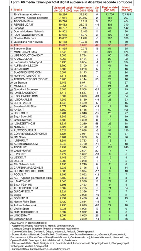 Secondo Comscore, nel mese di dicembre TPI ha totalizzato circa 13 milioni di utenti unici, facendo registrare una crescita del 47 per cento rispetto a novembre.