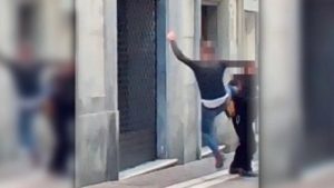 Prende la rincorsa, lo aggredisce alle spalle colpendolo con un violentissimo calcio a mezz’aria. Nessuno dei presenti interviene.