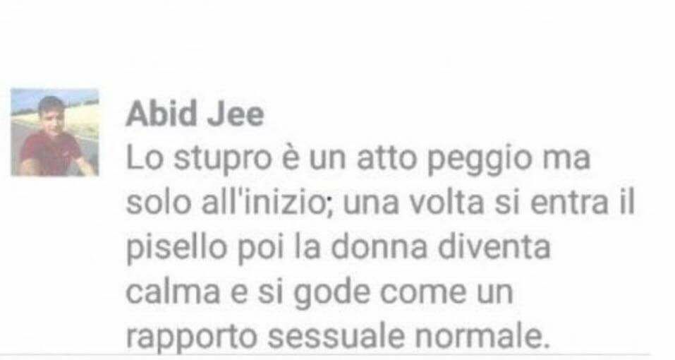Ha fatto molto discutere un commento pubblicato da un utente Facebook di nome Abid Jee che in merito alla vicenda ha scritto: “Lo stupro? Peggio solo all’inizio, una volta si entra il pisello poi la donna diventa calma e si gode come un rapporto sessuale normale”.