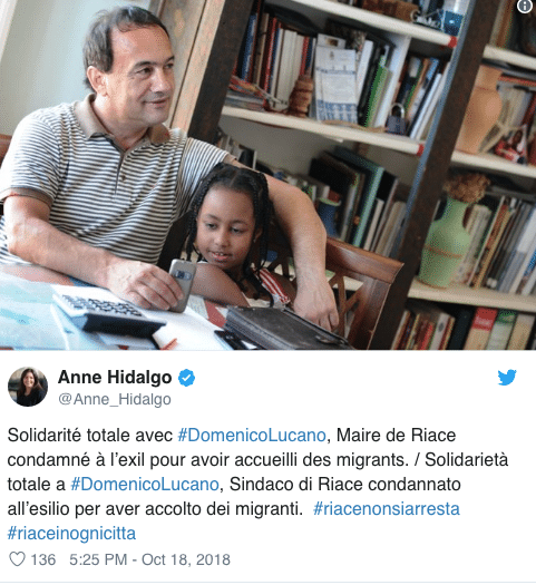 Anche Parigi si schiera in sostegno di Mimmo Lucano, il sindaco del comune di Riace accusato di favoreggiamento dell’immigrazione clandestina. La giunta comunale della Ville Lumière ha approvato una delibera in cui esprime il suo sostegno al primo cittadino del comune calabrese e in cui critica la decisione del governo italiano di sospenderlo dalla sua attività.