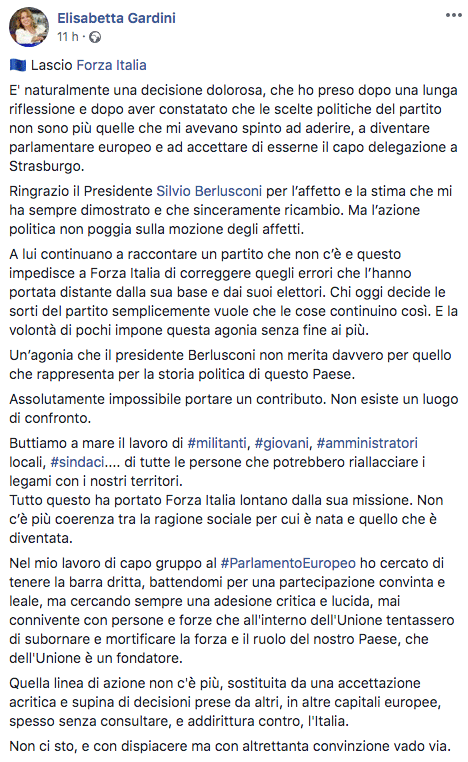 L’addio a Forza Italia è stato affidato a un post sul suo profilo Facebook: