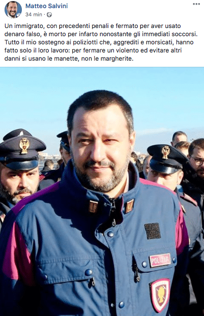 Nonostante le indagini siano ancora in corso, il ministro dell’Interno, Matteo Salvini, ha voluto portare la propria solidarietà agli agenti di polizia, postando una sua foto con l’ormai immancabile divisa: “Un immigrato, con precedenti penali e fermato per aver usato denaro falso, è morto per infarto nonostante gli immediati soccorsi. Tutto il mio sostegno ai poliziotti che, aggrediti e morsicati, hanno fatto solo il loro lavoro: per fermare un violento ed evitare altri danni si usano le manette, non le margherite”.