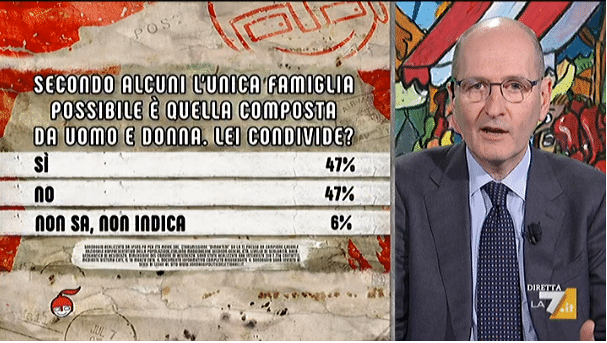 Circa un italiano su due pensa che l’unica famiglia possibile sia quella tra uomo e donna. È quanto emerge da un sondaggio condotto dall’istituto Ipsos di Nando Pagnoncelli e diffuso durante l’ultima puntata del programma tv DiMartedì, in onda su La7.