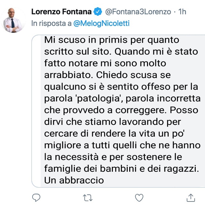 Il ministro Fontana è intervenuto successivamente per chiarire la sua posizione e chiedere scusa a coloro che aveva offeso: