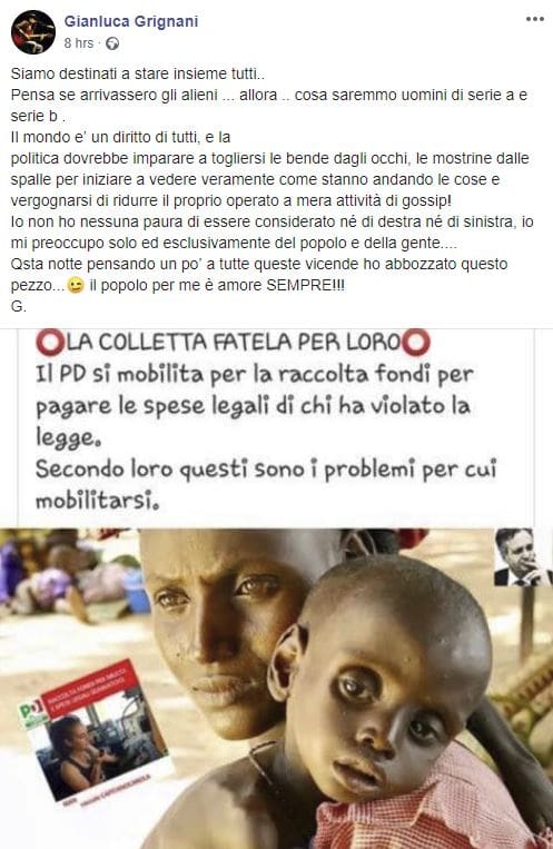 In un criptico post di Facebook, il cantante condivide l’immagine inquietante di due bambini neri visibilmente malati e deperiti dal titolo “La colletta fatela per loro“, accompagnata dalla frase “Il Pd si mobilita per pagare le spese legali di chi ha violato la legge. Secondo loro questi sono i motivi per cui mobilitarsi”.