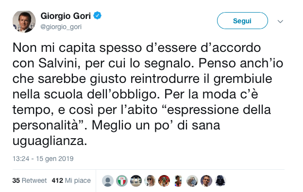 “Non mi capita spesso di essere d’accordo con Salvini” scrive Giorgio Gori sul suo profilo Twitter, “per cui lo segnalo. Penso anch’io che sarebbe giusto reintrodurre il grembiule nella scuola dell’obbligo”.