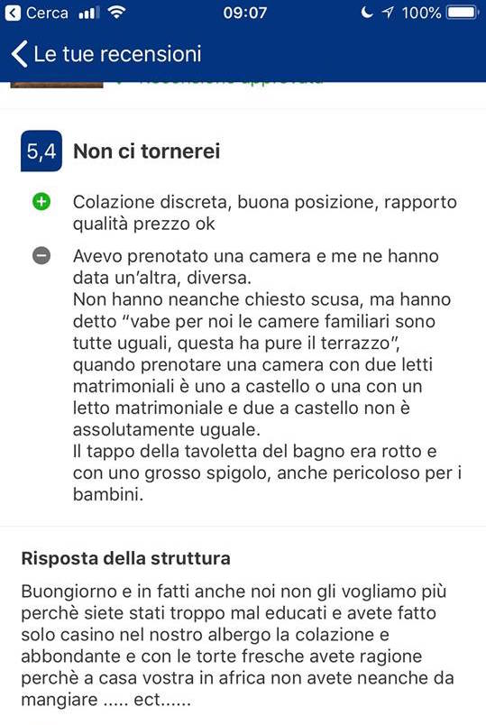 “Scendo in reception e faccio notare alla ragazza l’errore e risponde “eh noi abbiamo solo questa, ma che gli fa questa ha anche il balcone”. A quel punto cerco educatamente di spiegarle che non è questo il punto, avevo bisogno di due letti matrimoniali, avevo fatto una scelta durante la prenotazione, se avessi voluto due letti a castello avrei prenotato una camera diversa, e di nuovo, senza scusarsi mi dice che hanno solo quella camera e che per loro le camere don tutte uguali, vabbé, siccome dovevamo svegliarci presto non faccio ulteriore polemica e vado a letto”.