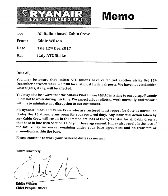 “Sarete a conoscenza che il sindacato dei piloti Alitalia Anpac sta provando a incoraggiare i piloti Ryanair a non lavorare il prossimo 15 dicembre, quando lo sciopero è previsto fra le 13 e le 17 locali.
