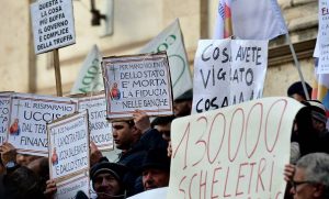 Ad oggi più di 500mila famiglie non sono state risarcite. Il suicidio del pensionato di Civitavecchia, il sig. D’Angelo, è solo uno delle centinaia di casi in tutta Italia. Storie disperate, storie di persone comuni che hanno visto i loro risparmi trasformarsi gradualmente in carta straccia con l’assenso complice e scellerato degli operatori di banca.