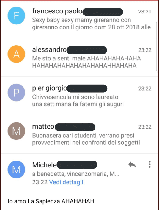 Bestemmie, insulti, minacce è quanto si può infatti leggere tra i messaggi giunti all’Ufficio della Sapienza incaricatosi di allertare gli studenti della sospensione delle lezioni.